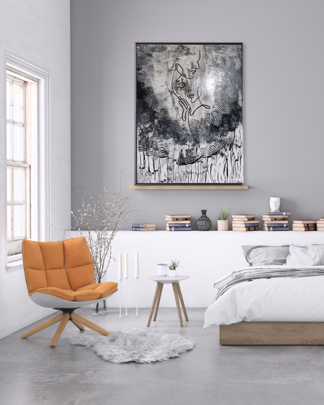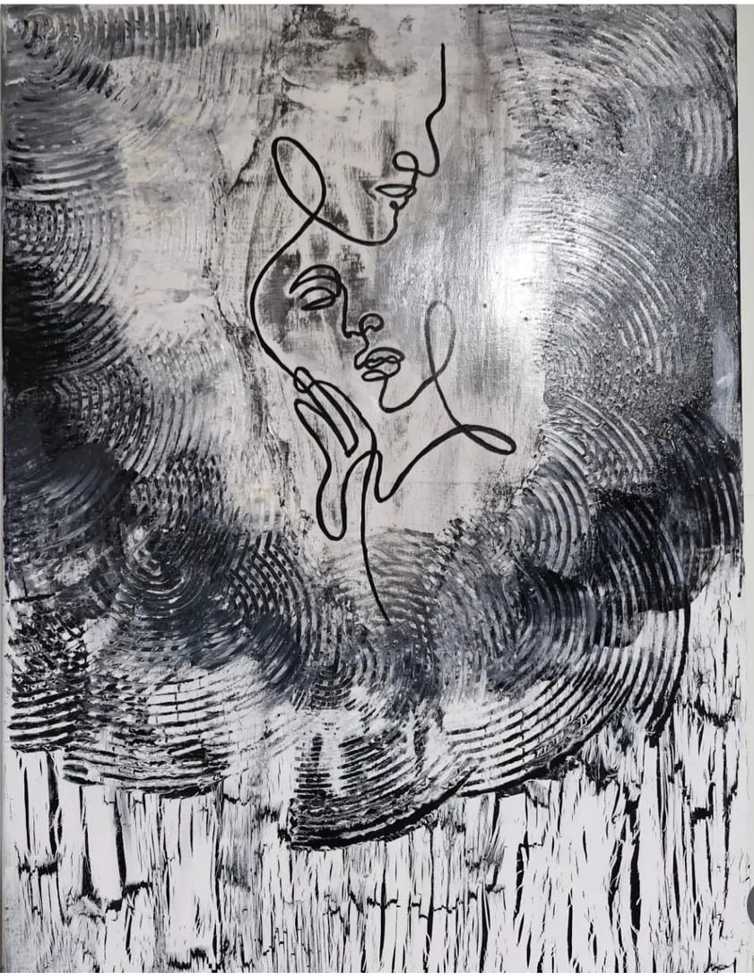 Obra única pintada a mano sobre lienzo. Combina un fondo abstracto en tonos negro, gris y blanco, con texturas circulares y efectos desgastados que aportan profundidad y movimiento.