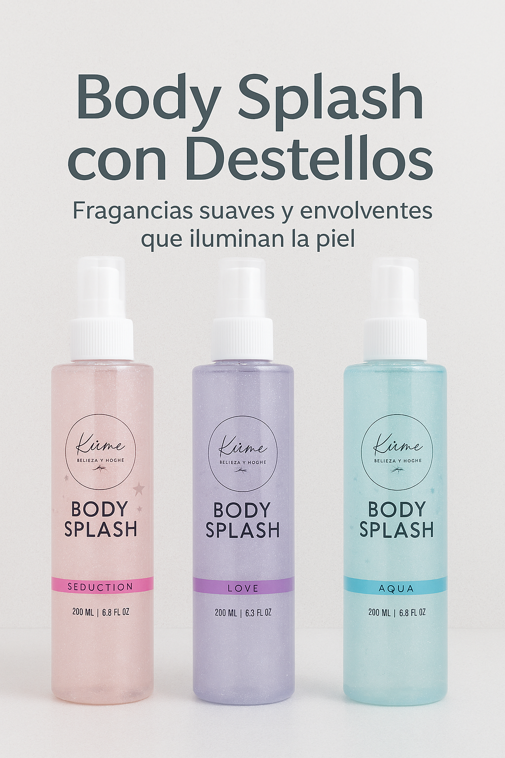 Refrescá tu piel y realzá tu brillo natural con los Body Splash con Destellos de Küme Belleza y Hogar. Fragancias suaves y envolventes que perfuman delicadamente el cuerpo, dejando una sensación fresca, liviana y luminosa durante todo el día.