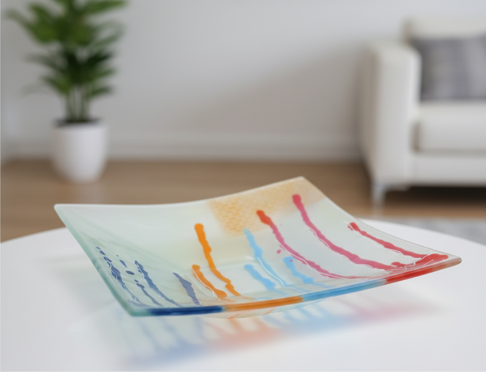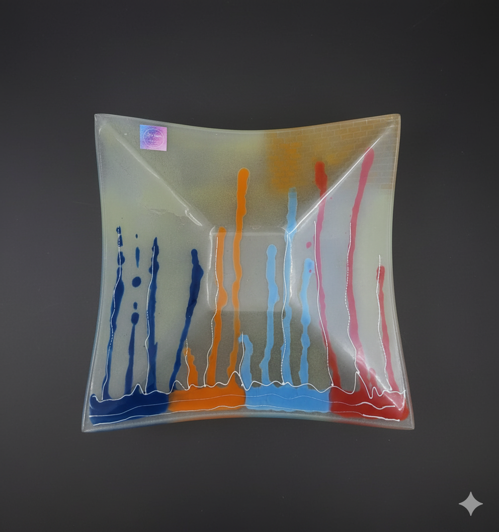 Obra única realizada a mano mediante la técnica de vitrofusión, donde el vidrio se transforma en arte a través del color y el calor.